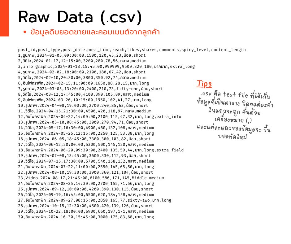 df = pd.read_csv("/Social_media_raw.csv", on_bad_lines='warn')- 👉 “เปิดไฟล์ CSV เหมือนแกะกล่องพัสดุ”