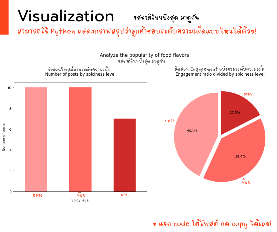 - เราสร้างกราฟแท่งเพื่อแสดงจำนวนโพสต์ในแต่ละระดับความเผ็ด ให้เราเห็นว่าเราสร้างคอนเทนต์รสชาติไหนออกมามากที่สุด เปรียบเหมือนการดูว่ามี “ผู้เข้าแข่งขัน” ในแต่ละระดับความเผ็ดมากน้อยแค่ไหน